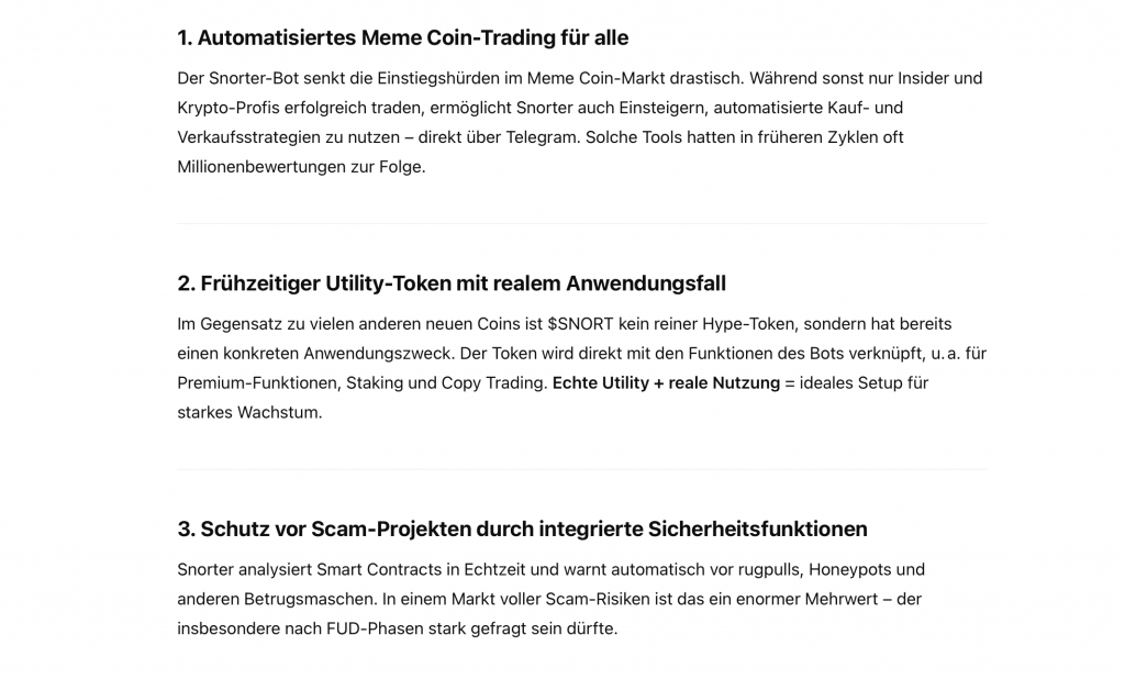 Konfrontiert man die KI von OpenAI mit der Frage, welcher Coin nach der Rallye von Ethereum und XRP Potenzial hat, fällt schnell der Name Snorter. Dabei nennt ChatGPT auch viele Gründe, warum der $SNORT-Kurs nach dem Launch durch die Decke gehen könnte. Vor allem die hohe Nachfrage schon während des Vorverkaufs und die praktischen Funktionen des Bots werden dabei als Gründe für eine potenzielle Kursexplosion genannt.