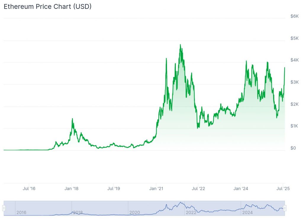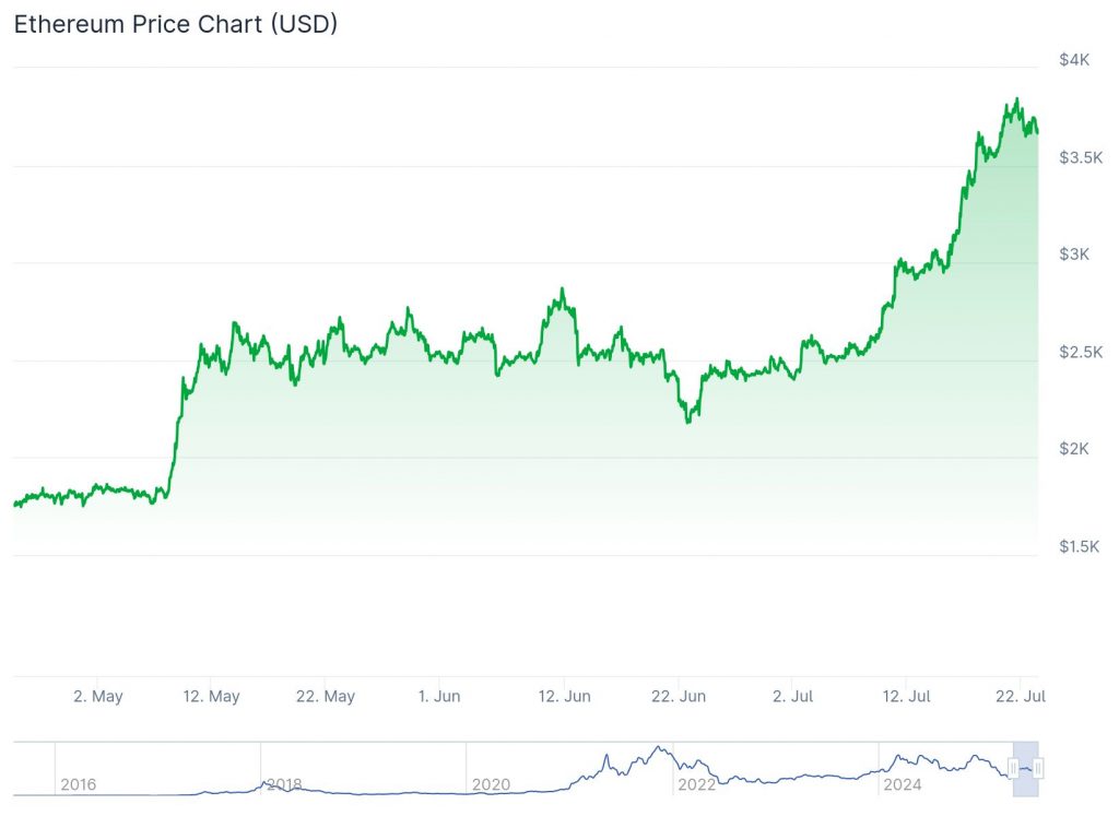 Der Ethereum-Kurs hat in den vergangenen Wochen deutlich an Dynamik gewonnen und Anleger wie Analysten gleichermaßen überrascht. Nach einer langen Phase der Seitwärtsbewegung und mehreren gescheiterten Ausbruchsversuchen über die 4.000-$-Marke, verdichten sich nun die Anzeichen, dass ETH kurz vor einem Durchbruch stehen könnte. Jetzt stellt sich die Frage: Ist eine Rallye über 4.000 $ bis Ende Juli tatsächlich realistisch?