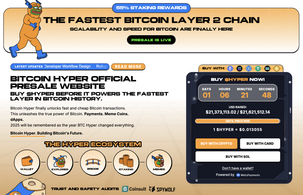 Dementsprechend viel Interesse gibt es am Kauf von HYPER im Presale. Der Vorverkauf hat in den letzten Tagen mehr und mehr an Dynamik gewonnen und konnte bereits rund 21 Millionen $ an Funding von interessierten Investoren generieren. Der Preis pro Coin beläuft sich dabei derzeit auf 0,013055 $, und es kann sowohl mit Bankkarte als auch mit etablierten Kryptos gekauft werden.
