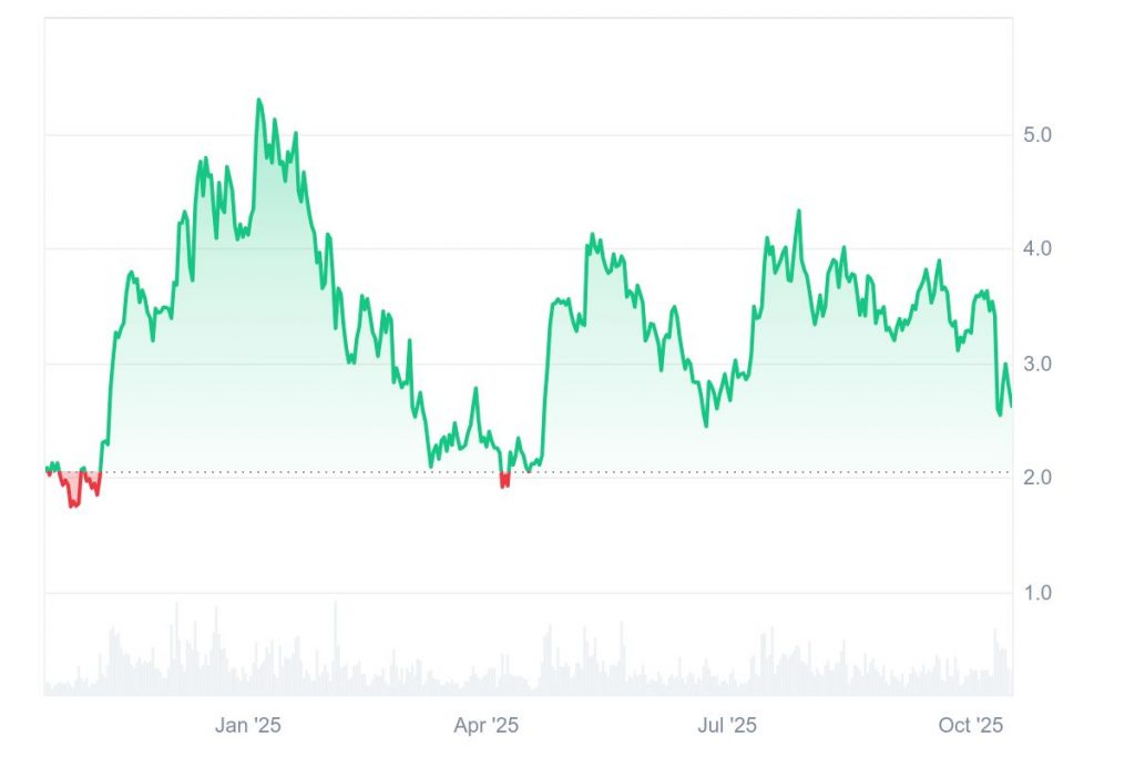 Nach einem seitwärts gerichteten Trend von Juli bis Anfang Oktober zwischen 3 $ und 4 $ ist der Kurs jetzt nach unten aus dieser Preisrange ausgebrochen. Das sorgt bei vielen Anlegern für Verunsicherung, da sie befürchten, dass der SUI-Preis jetzt noch deutlich weiter in Richtung des Langzeit-Supports bei 2 $ absinken könnte. Doch wie realistisch ist ein solches Szenario?