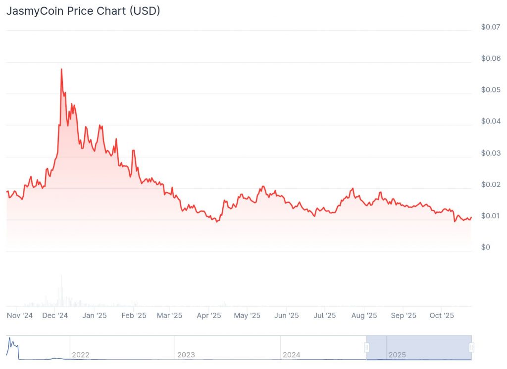 Nachdem der JASMY-Token in den vergangenen Wochen auf die wichtige Unterstützungszone bei 0,01 $ gefallen ist, wittern Anleger nun Chancen auf eine mögliche Erholungsrallye. Technisch gilt das aktuelle Niveau als langfristiger Support, von dem aus bereits in der Vergangenheit starke Aufwärtsbewegungen gestartet sind. Doch reicht die Marktstimmung aus, um JASMY wieder in Richtung seiner früheren Hochs zu treiben?