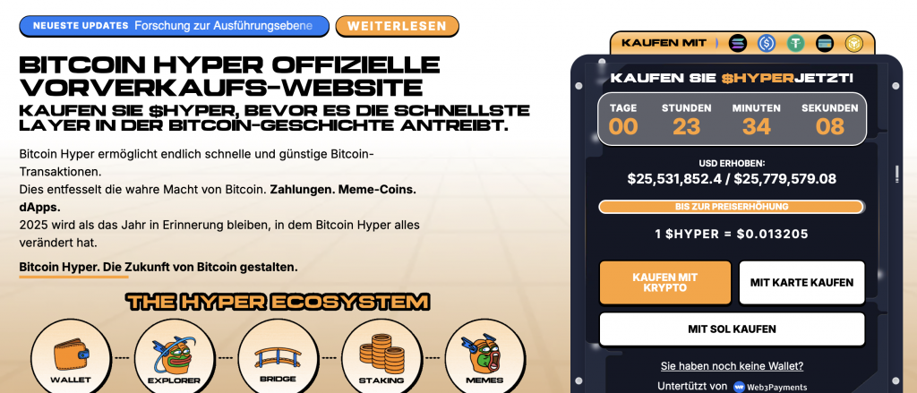 Der native Token $HYPER befindet sich aktuell noch im Vorverkauf und das Interesse könnte nicht größer sein.Mehr als 25 Millionen Dollar wurden bereits investiert, womit $HYPER im ICO erfolgreicher ist als Ethereum damals. Analysten sehen darin einen der am besten positionierten Altcoins des Jahres, weil das Projekt an einem Punkt ansetzt, der den gesamten Bitcoin-Sektor verändern kann. Sollte Bitcoin Hyper tatsächlich zum führenden DeFi-Layer für BTC werden, wäre das Kurspotenzial enorm, da selbst ein moderater Funktions-Zuwachs für Bitcoin milliardenschwere Kapitalzuflüsse auslösen könnte.