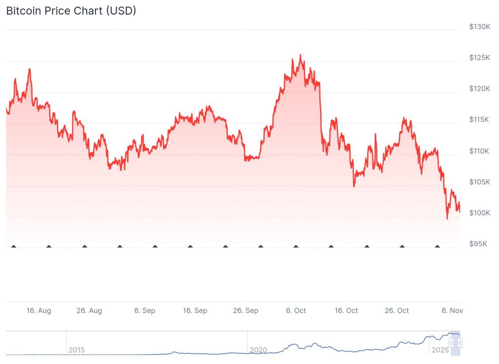 Im Verlauf der letzten Woche ist der Kurs erstmals seit Juni wieder auf die 100.000 $-Marke zurückgefallen. Damit befindet sich BTC im Monatsvergleich 17,5 % im Minus. Heute gab es erneut einen Kursverlust von 1,6 %, wodurch BTC aktuell bei 101.000 $ notiert. Die Konsolidierung hat laut Krypto-Quant dazu geführt, dass der sogenannte Bitcoin Bull Score auf 0 gefallen ist.