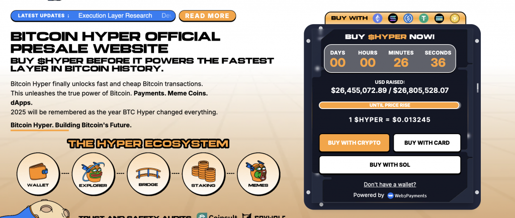 Im Zentrum des Netzwerks steht der $HYPER-Token, der für Transaktionsgebühren, Governance und Staking genutzt wird. Da sich das Projekt noch in der Presale-Phase befindet, können Anleger $HYPER-Token aktuell zu einem stark vergünstigten Preis kaufen. Schon jetzt wurden über 26 Millionen Dollar investiert, was $HYPER zu einem der erfolgreichsten Krypto-Presales der letzten Jahre macht. Viele Analysten sehen in Bitcoin Hyper die verbindende Brücke zwischen Bitcoin und Solana, ein Ansatz, der das Beste aus beiden Welten vereint. Sollte das Projekt sein Ziel erreichen, könnte $HYPER zu den renditestärksten Altcoins des Jahres gehören, wobei auch eine Kurssteigerung um weit mehr als 1.000 % keine große Überraschung wäre.