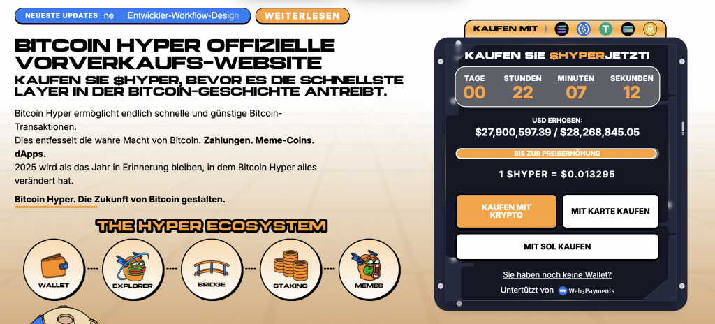 Damit adressiert Bitcoin Hyper eines der größten Probleme des Bitcoin-Ökosystems und könnte zu einem der wichtigsten Projekte der kommenden Jahre werden. Der zugehörige Token $HYPER befindet sich aktuell noch im Presale und die Nachfrage spricht für sich. Bereits fast 28 Millionen Dollar wurden investiert. Damit gehört Bitcoin Hyper schon jetzt zu den erfolgreichsten Presales überhaupt und viele Analysten halten nach dem Börsenlisting eine Kursexplosion für wahrscheinlich. Wer von diesem Momentum profitieren möchte, kann sich noch vor dem nächsten Preissprung mit $HYPER eindecken, da der Preis schon während des Vorverkaufs mehrfach erhöht wird. .
