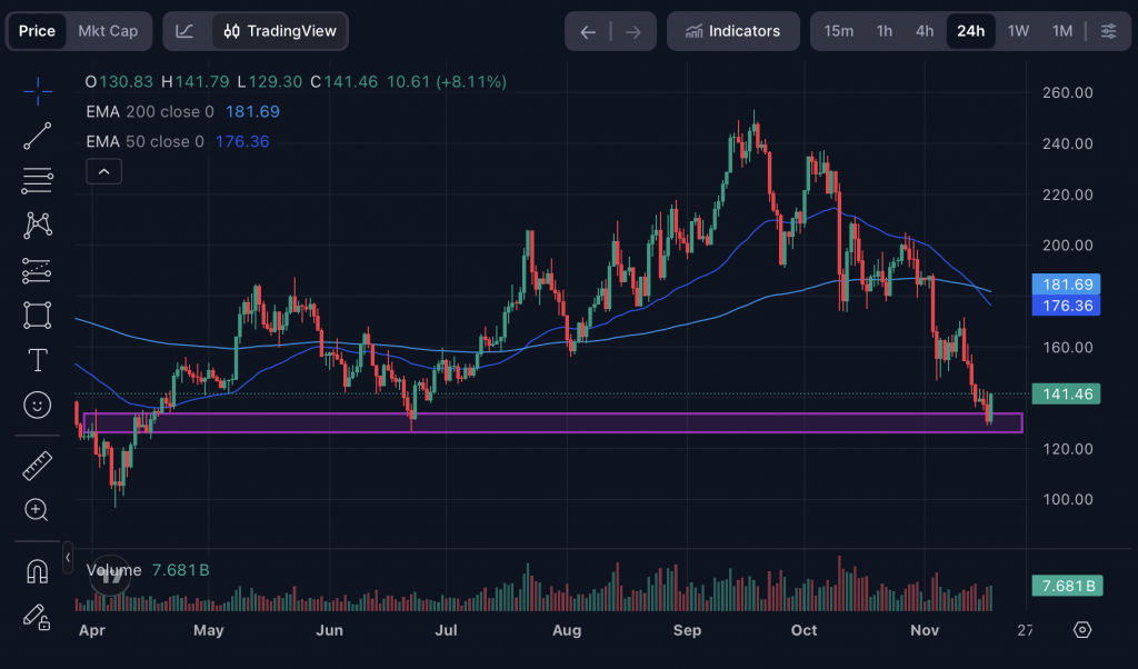 Wer ausschließlich auf den Chart schaut, sieht auf den ersten Blick wenig Grund für Optimismus. Seit mehreren Monaten befindet sich Solana in einem klaren Abwärtstrend. Dennoch gibt es einen Lichtblick. Der Kurs hat genau an einer bedeutsamen Zone nach oben gedreht. Rund um 130 Dollar hat sich offenbar eine deutliche Unterstützung gebildet, die auch diesmal zu greifen scheint.