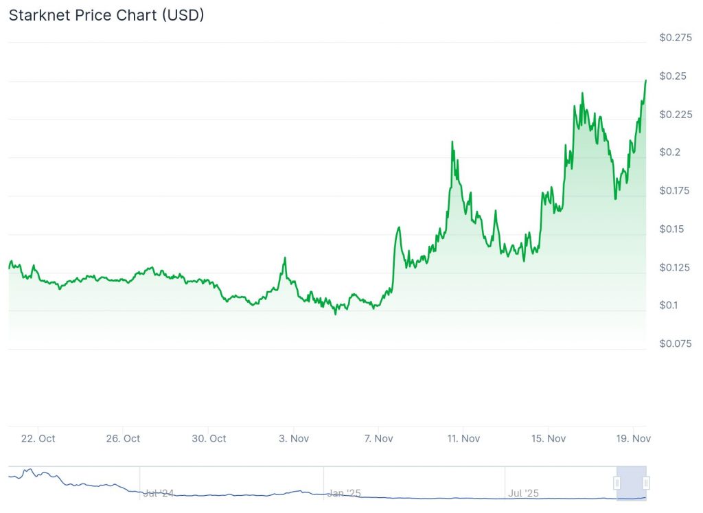 Erst Anfang November war STRK zum letzten Mal auf dieses wichtige Unterstützungsniveau zurückgefallen. Dann kam jedoch überraschenderweise wieder starkes Momentum auf. Binnen weniger Wochen hat sich der Kurs nun mehr als verdoppelt, und mit einem heutigen 24-Stunden-Gewinn von 24,85 % ist STRK sogar der Top-Performer unter den Top 100 Coins nach Marktkapitalisierung. Der Preis durchbrach gerade erst wieder die 0,25-$-Marke und tradet damit auf dem höchsten Niveau seit Beginn des Jahres.
