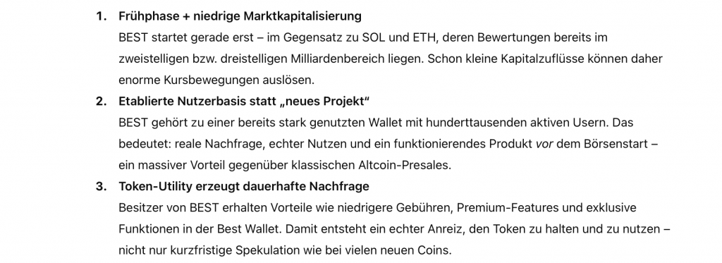 Diese Kombination aus etablierter Anwendung und neuem Coin ist äußerst selten und wird nach Einschätzung der KI für massiven Kaufdruck sorgen. ChatGPT hebt hervor, dass sowohl die frühe Marktphase als auch die starke mediale Aufmerksamkeit darauf hindeuten, dass $BEST in den kommenden Tagen und Wochen deutlich stärker steigen könnte als Solana oder Ethereum. Dazu kommt der reale Nutzen. Nutzer der Wallet erhalten durch den Token Vorteile wie geringere Swap-Gebühren und zusätzliche Premium-Funktionen. Das ist ein echter Anwendungszweck, der die Nachfrage langfristig stärken kann. Der Presale endet in wenigen Stunden. Wer noch zum Fixpreis investieren möchte, hat nur noch wenig Zeit. Nach dem Börsenlisting erwarten Analysten eine Kursexplosion.