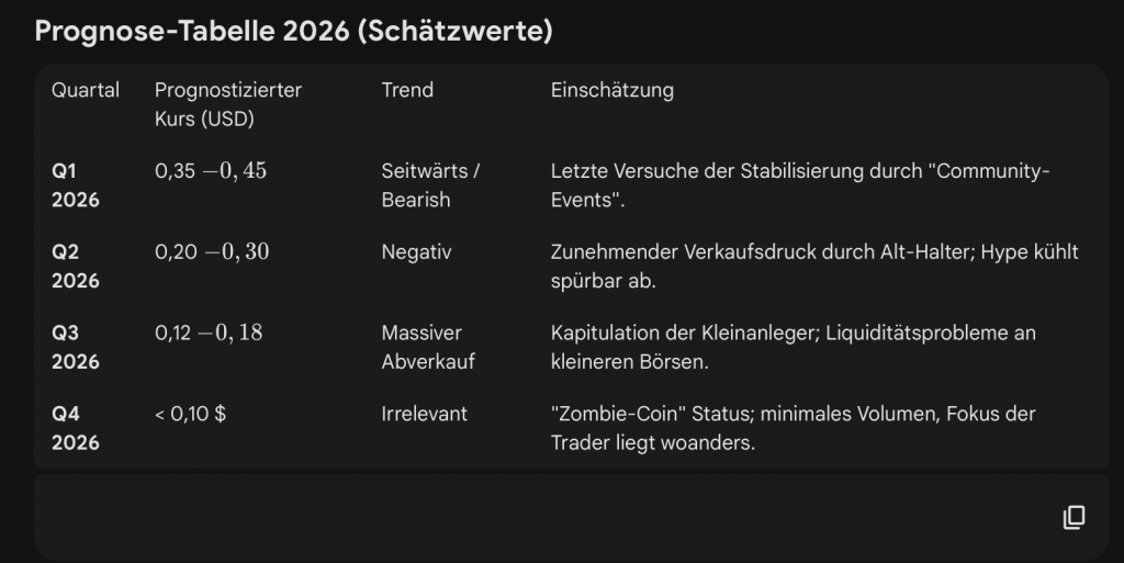 Besonders kritisch bewertet Gemini die On-Chain-Daten. Große Wallets, die den Kurs während der Hochphase maßgeblich stützten, hätten bereits damit begonnen, systematisch Liquidität abzuziehen. Diese Abverkäufe deuteten darauf hin, dass professionellere Marktteilnehmer kein weiteres Aufwärtspotenzial mehr sehen. Zurück bleibe eine fragmentierte Community, die stark von Durchhalteparolen einzelner Influencer geprägt sei, während der strukturelle Verkaufsdruck weiter zunehme.