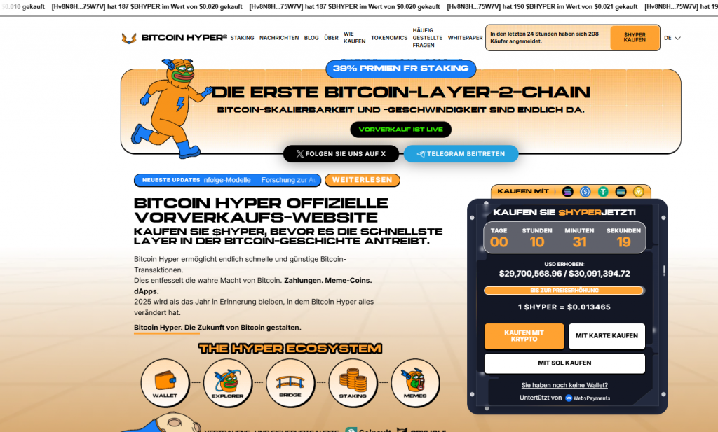 Interessant bleibt jedoch die Entwicklung bei Bitcoin Hyper ($HYPER). Der Presale Memecoin nähert sich schon der 30 Millionen US-Dollar Marke, das Interesse an der Layer 2 Blockchain scheint auch in dieser Marktphase ungebrochen.
