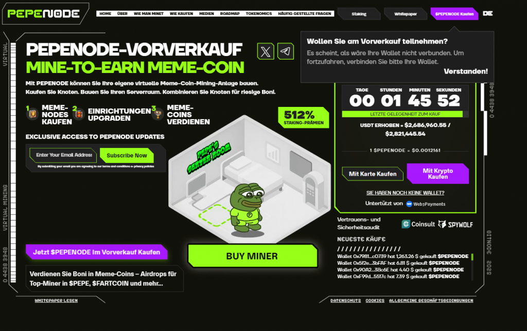 Damit bleibt für viele die kurzfristige Situation ungewiss. Allerdings steht auch heute ein wichtiges Ereignis am Plan, wo viele Anleger auf eine echte Kursachterbahn warten. PepeNode startet heute um 15:00 Uhr den Handel auf dezentralen Börsen. Das Projekt verbindet Meme-Kultur mit einem Mining-basierten Web3-Game und setzt auf strategisches Gameplay statt einfacher Klickmechaniken.