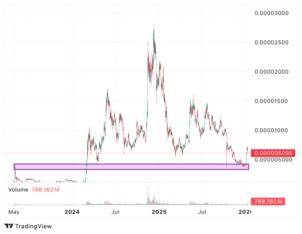 PEPE ist kraftvoll aus einer mehrmonatigen Nachfragezone nach oben abgeprallt, in der der Markt wiederholt Verkaufsdruck absorbiert hatte. Entscheidend: Der Coin markierte das erste höhere Tief seit November, wodurch sich die kurzfristige Markstruktur von einer anhaltenden Abwärtsbewegung hin zu einem potenziellen Trendwechsel verschoben hat.