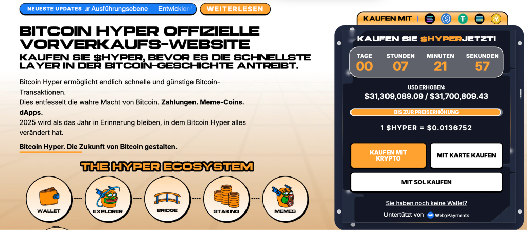 Der HYPER Token spielt dabei eine zentrale Rolle innerhalb des Systems und soll als Bindeglied zwischen Bitcoin und erweiterten Funktionen dienen. In einem Marktumfeld, das zunehmend von institutionellem Kapital und wachsendem Interesse geprägt ist, gewinnen solche technologischen Erweiterungen an Bedeutung, da sie den praktischen Nutzen von Bitcoin langfristig erhöhen könnten. Aktuell ist der HYPER-Token im Vorverkauf erhältlich und schon in dieser frühen Phase explodiert die Nachfrage, sodass inzwischen bereits über 31 Millionen Dollar in das Projekt investiert wurden. Es wird daher vermutet, dass der Kurs nach dem Börsenstart schnell um ein Vielfaches steigen könnte.