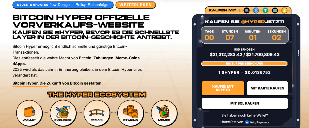 Der HYPER Token nimmt innerhalb dieser neuen Layer-2-Lösung eine zentrale Rolle ein und wird für Transaktionsgebühren, Governance, Staking und Liquidität auf der Hyper Chain benötigt. In einem Marktumfeld, das von Unsicherheit und starken Schwankungen geprägt ist, richten sich die Blicke vieler Anleger verstärkt auf Projekte, die langfristigen Nutzen und technologische Innovation in den Vordergrund stellen. Aktuell ist $HYPER noch im Vorverkauf erhältlich, wobei bereits über 31 Millionen Dollar investiert wurden. Das spricht für einen starken Börsenstart, wobei einige Analysten von einer massiven Kurssteigerung nach dem Launch ausgehen.