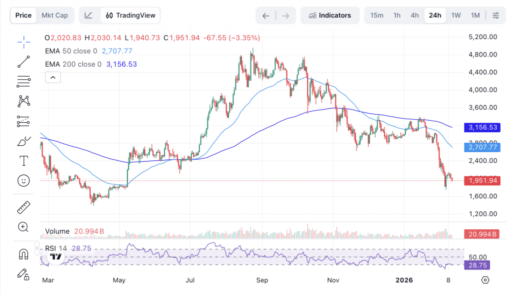 Ein Blick auf den Tageschart zeigt ein klares Bild. Ethereum notiert unter der 50-Tage-EMA sowie deutlich unter der 200-Tage-Linie. Diese Konstellation gilt klassisch als bärisch. Zusätzlich signalisiert der RSI mit Werten unter 30 eine stark überverkaufte Situation.
