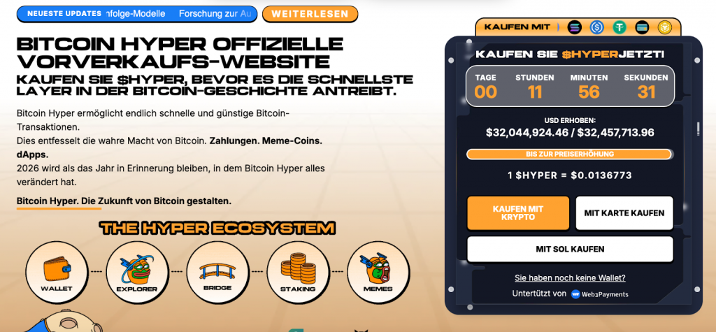 Der Hyper Token ist aktuell im Vorverkauf erhältlich, in den bereits über 32 Millionen US-Dollar investiert wurden. Gerade in einer Marktphase, in der immer mehr Kapital in Blockchain-Infrastruktur, tokenisierte Finanzprodukte und neue Onchain-Anwendungsfälle fließt, bekommt ein Projekt wie Bitcoin Hyper zusätzliche Aufmerksamkeit. Durch das große Interesse der Krypto-Community an $HYPER, wird davon ausgegangen, dass der Preis beim offiziellen Börsenlisting stark ansteigen könnte.