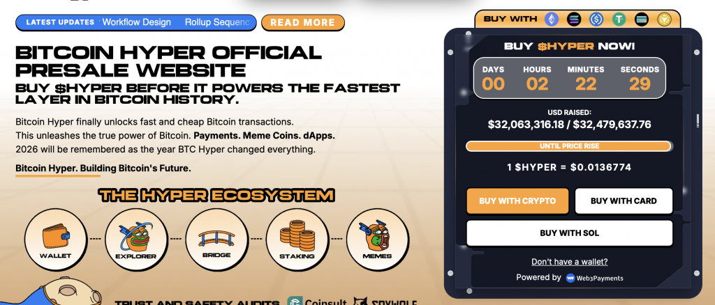 Der $HYPER-Token befindet sich aktuell noch im Vorverkauf und stößt bereits auf großes Interesse. Sollte sich das Konzept durchsetzen, könnte Bitcoin Hyper eine wichtige Rolle im nächsten Marktzyklus spielen und die Nutzung von Bitcoin deutlich erweitern. Schon während des Presales wurden über 32 Millionen Dollar investiert, was Bitcoin Hyper zu einem der vielversprechendsten Altcoins in diesem Jahr macht.