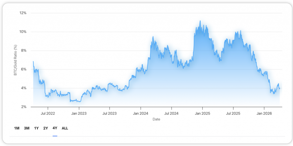 Im Jahr 2021 lag die Marktkapitalisierung von Gold bei rund 11 Billionen US-Dollar, während Bitcoin etwa 1,26 Billionen US-Dollar erreichte – also rund 10 % Marktanteil im Store-of-Value-Segment. Heute, im Jahr 2026, wird Gold auf etwa 31 Billionen US-Dollar geschätzt, während Bitcoin mit rund 1,33 Billionen US-Dollar kaum gewachsen ist. Der Marktanteil von Bitcoin ist damit auf etwa 3,8 % gefallen.