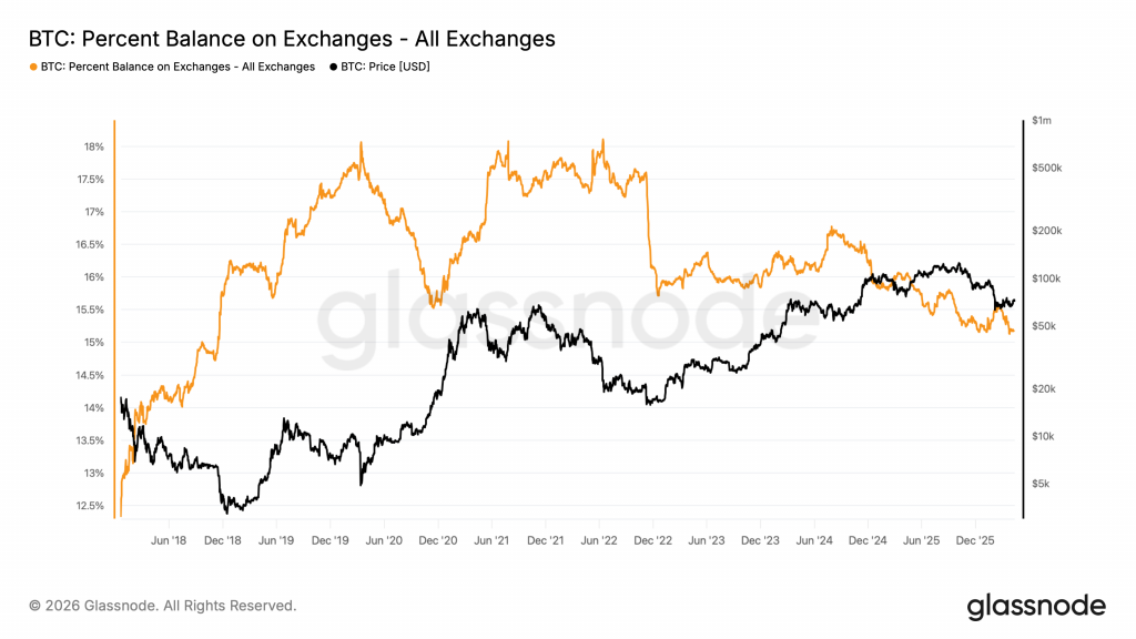 Parallel dazu zeigen On-Chain-Daten von Glassnode eine klare Entwicklung auf der Angebotsseite. Die Bitcoin-Bestände auf zentralisierten Börsen sind auf den niedrigsten Stand seit rund sieben Jahren gefallen. Konkret bedeutet das: Immer weniger BTC stehen kurzfristig für den Verkauf zur Verfügung. Dieser Rückgang der Exchange-Reserven ist ein klassisches Signal für zunehmende Knappheit, da Coins vermehrt in Cold Wallets oder langfristige Verwahrung überführt werden.