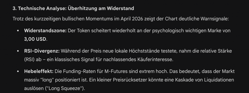 Eine aktuelle Einschätzung von Google Gemini zeichnet ein deutlich kritisches Bild der aktuellen Lage rund um MemeCore. Trotz der beeindruckenden Performance von über 10.000 % innerhalb eines Jahres sieht die Analyse klare Warnsignale, die auf ein mögliches Top hindeuten könnten. Besonders auffällig ist die Diskrepanz zwischen Bewertung und tatsächlicher Nutzung. Die Blockchain selbst generiert laut Daten kaum nennenswerte Gebühren – ein Hinweis darauf, dass reale Aktivität fehlt und das Volumen möglicherweise künstlich aufgebläht wurde. Für ein Projekt mit Milliardenbewertung wäre das ein massives Ungleichgewicht.