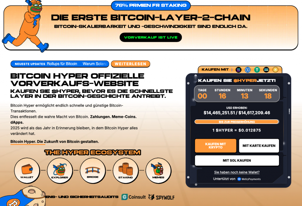 So wird HYPER über die offizielle Website aktuell noch zum rabattierten Festpreis von 0,012875 $ verkauft, und es kamen bereits über 14,45 Millionen $ an Funding von interessierten Investoren zusammen. Im Presale erworbene Coins können zudem auch für eine jährliche Rendite von bis zu 76 % gestakt werden.