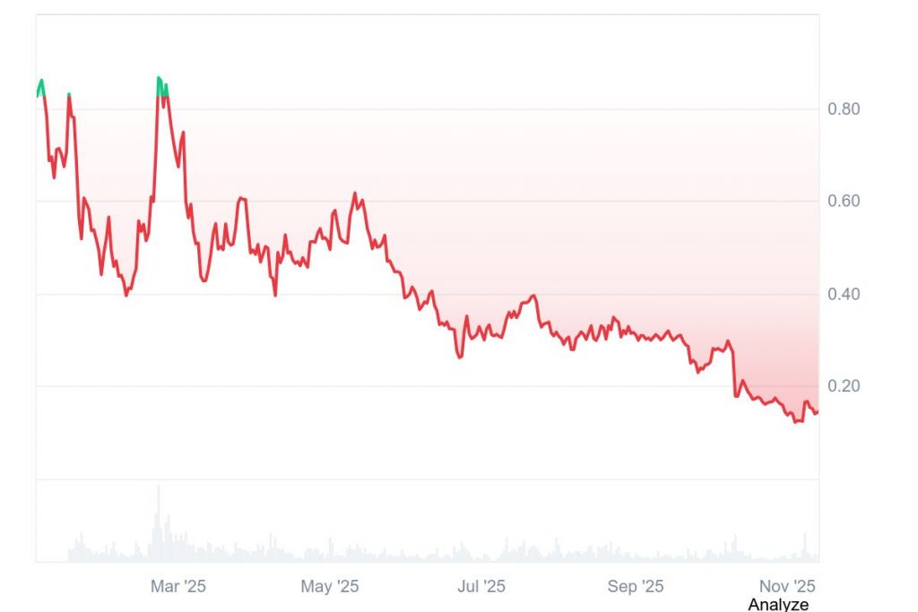 Der Kurs der Kryptowährung Sonic steht derzeit enorm unter Druck. Von ihrem Höchststand im Januar bei knapp über 1 $ ist sie inzwischen um fast 90 % zurückgefallen. Dabei wurden in den letzten Wochen immer wieder tiefere Tiefs gesetzt. Am 4. November fiel der Kurs zeitweise sogar unter 0,12 $ zurück, und auch aktuell tradet S nur bei etwa 0,145 $.