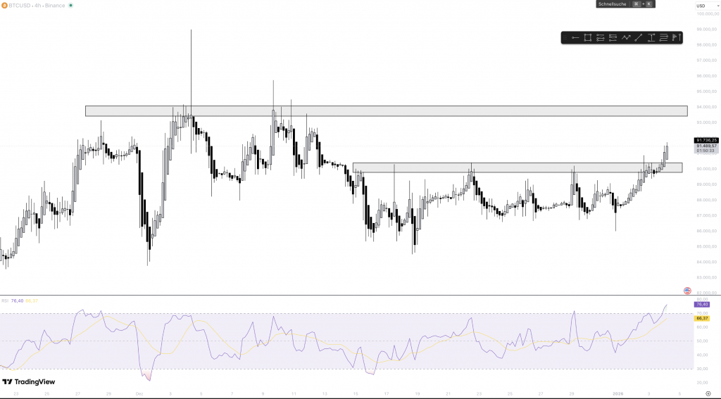 Noch wichtiger ist jedoch der Blick auf den Chart, denn technisch lässt sich bei Bitcoin zunehmend ein Ausbruch erkennen. Im Vier-Stunden-Chart ist zu sehen, dass der Kurs zuletzt den Bereich zwischen 89.500 und 90.500 US-Dollar überwinden konnte. Diese Zone hatte zuvor mehrfach als hartnäckiger charttechnischer Widerstand fungiert und wurde in den vergangenen Handelstagen immer wieder getestet. Mit dem jüngsten Anstieg gelingt Bitcoin erstmals seit Mitte Dezember ein nachhaltiger Bruch über dieses Niveau, was das kurzfristige Momentum klar stärkt.